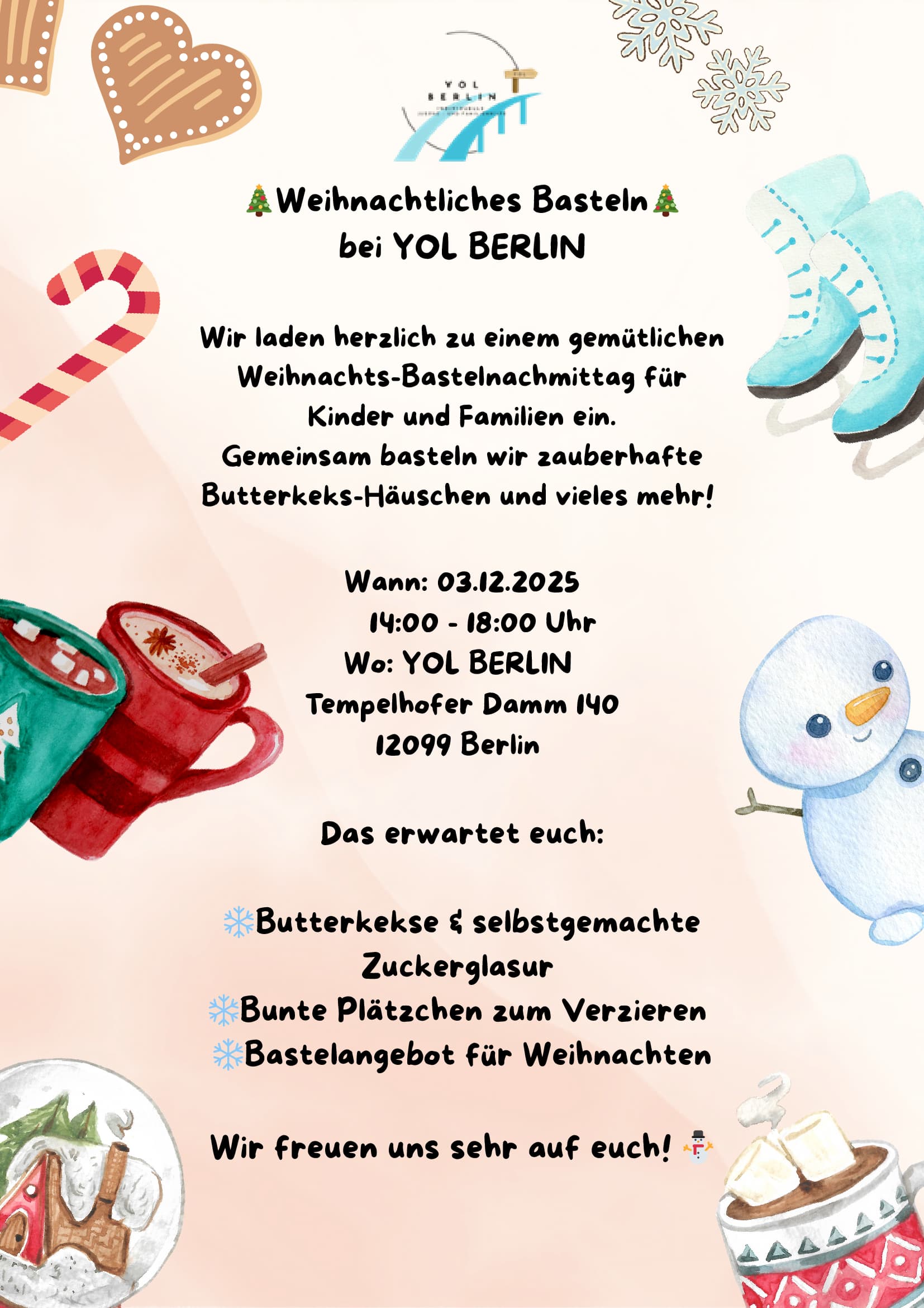 Die YOL BERLIN gGmbH freut sich, in diesem Jahr zum ersten Mal einen festlichen Weihnachts-Bastelnachmittag für Kinder und Familien anbieten zu dürfen. Gemeinsam gestalten wir kreative Butterkeks-Häuschen und viele weitere weihnachtliche Kunstwerke.